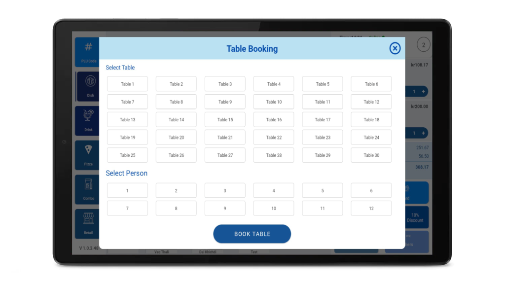 Table booking functionality is available to help manage dine-in service more effectively. This feature supports organized table handling and improves the flow of guests throughout the service period.